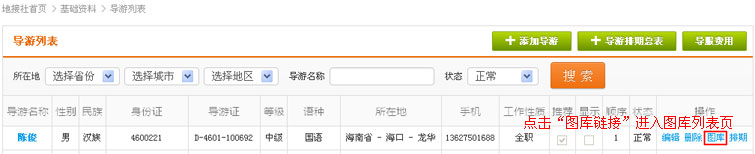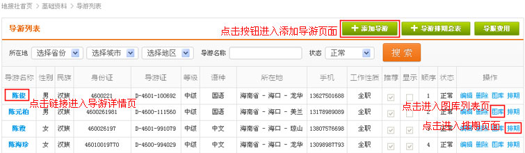 在导游列表操作中,找到“图库”链接,点击进入图库页面(基础资料图库页面一致,此外将不再作出说明)