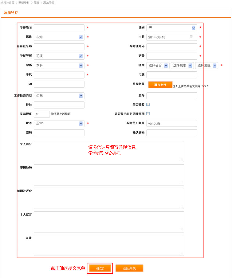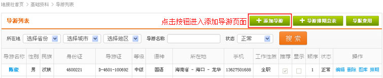 在添加导游认真填写信息后,点击提交表单。