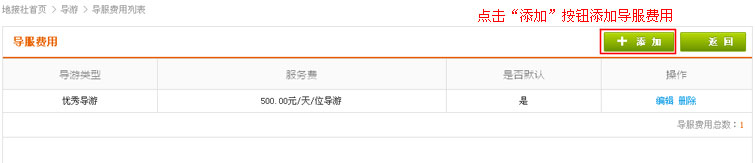 在导服费用列表中找到“添加导服费用”按钮,点击进入