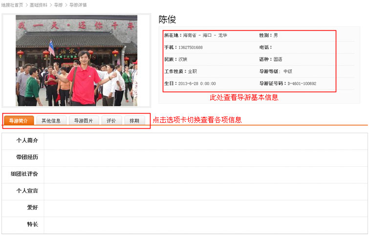 3.进入详情页面,查看导游资料