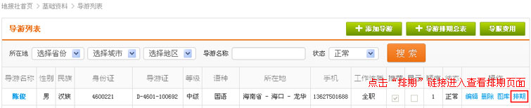 在导游列表操作中,找到“排期”链接,点击进入