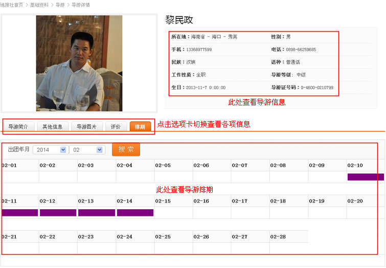 在导游详情页面查看排期信息