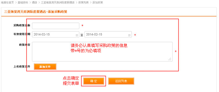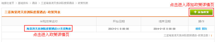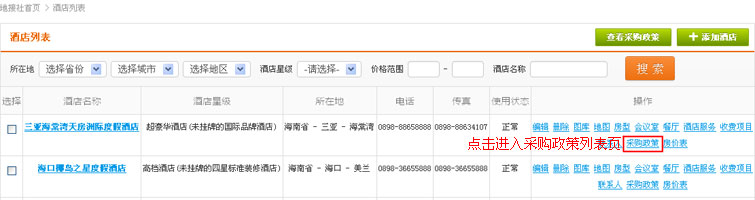在酒店列表操作中,找到“采购政策”链接,点击进入