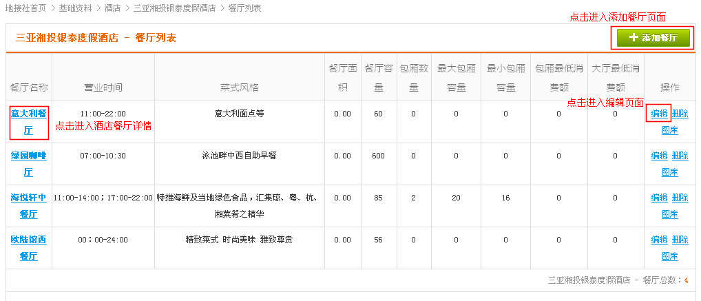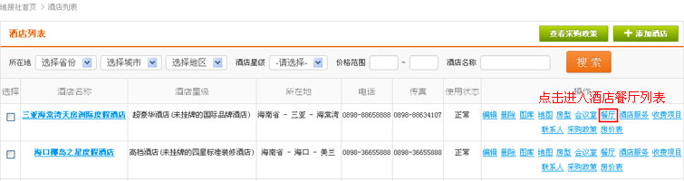 在酒店列表操作中,找到“餐厅”链接,点击进入