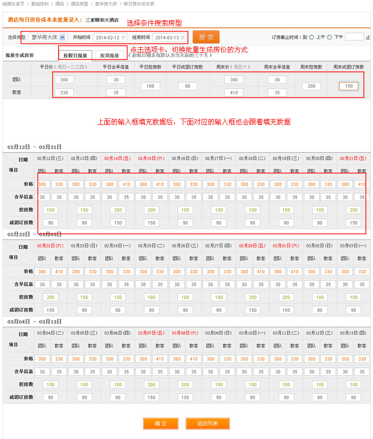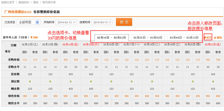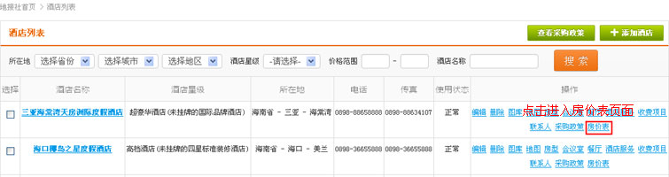 在酒店列表操作中,找到“房价表”链接,点击进入