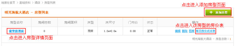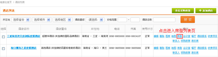 在酒店列表操作中,找到“房型”链接,点击进入