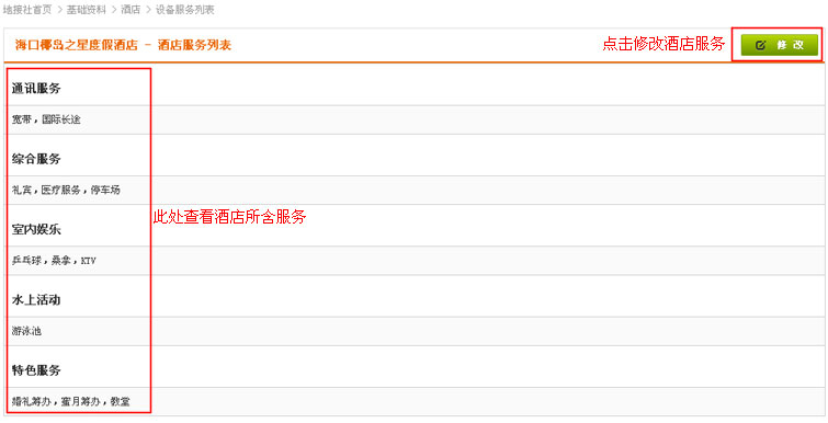 进入酒店服务页面后,找到“修改”按钮,点击进入修改酒店服务