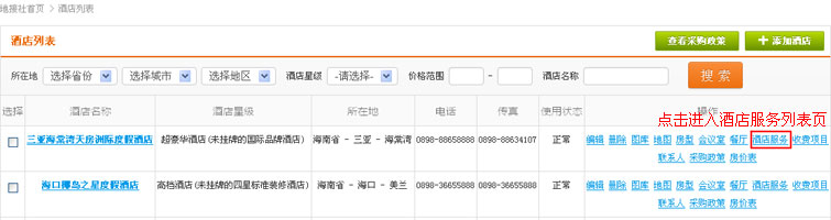 在酒店列表操作中,找到“酒店服务”链接,点击进入