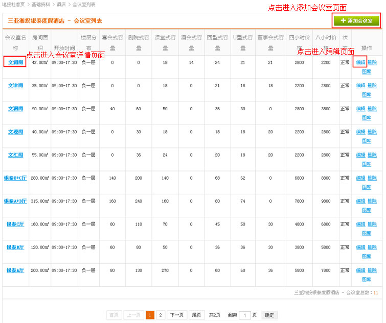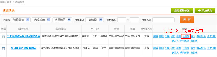 在酒店列表操作中,找到“会议室”链接,点击进入