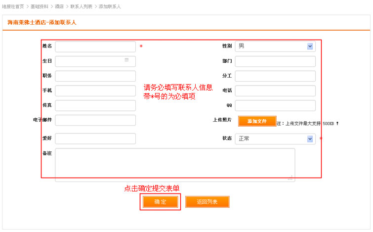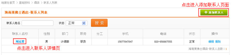 在酒店列表操作中,找到“联系人”链接,点击进入