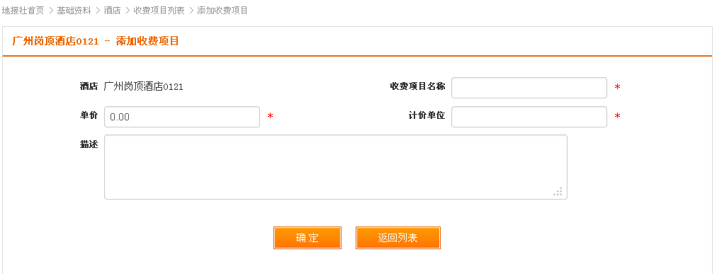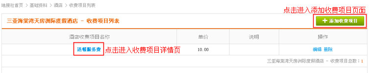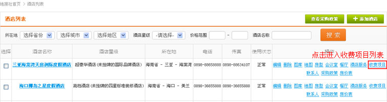 在酒店列表操作中,找到“收费项目”链接,点击进入