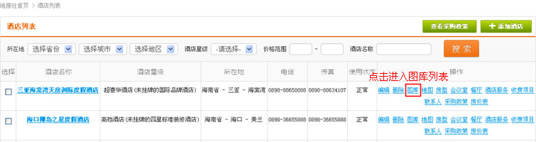 在酒店列表操作中,找到“图库”链接,点击进入图库页面(基础资料图库页面一致,此外将不再作出说明)