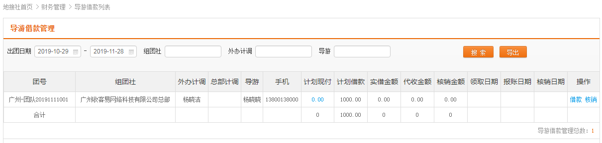 通过导航【财务管理-导游借款管理】进入