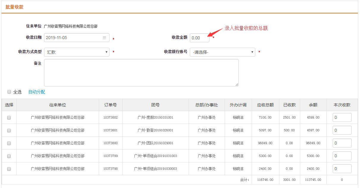 ① 全选后,点击“自动分配”,系统自动将收款总金额按订单余额依次自动填写订单的本次收款金额