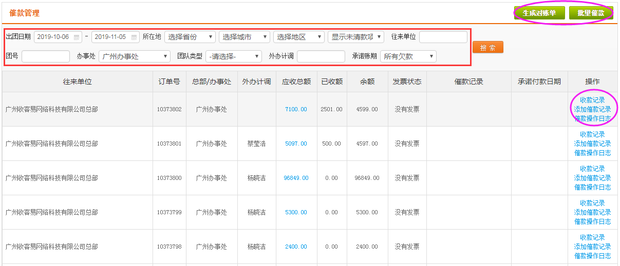 1. 可以按团期、供应商等搜索订单后,对订单进行催款、批量催款、生成对账单、查看催款日志、查看收款记录等操作,以便及时回收团款。