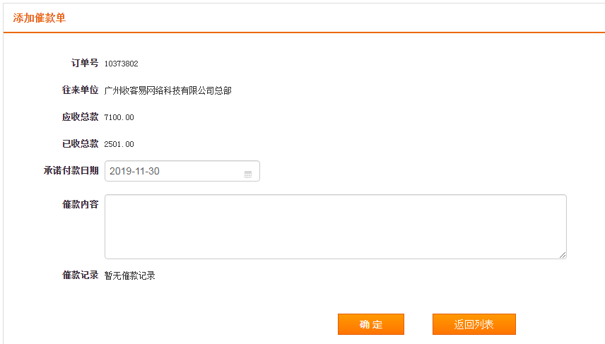 2. 添加催款记录:录入客户承诺付款日期及催款内容,提交
