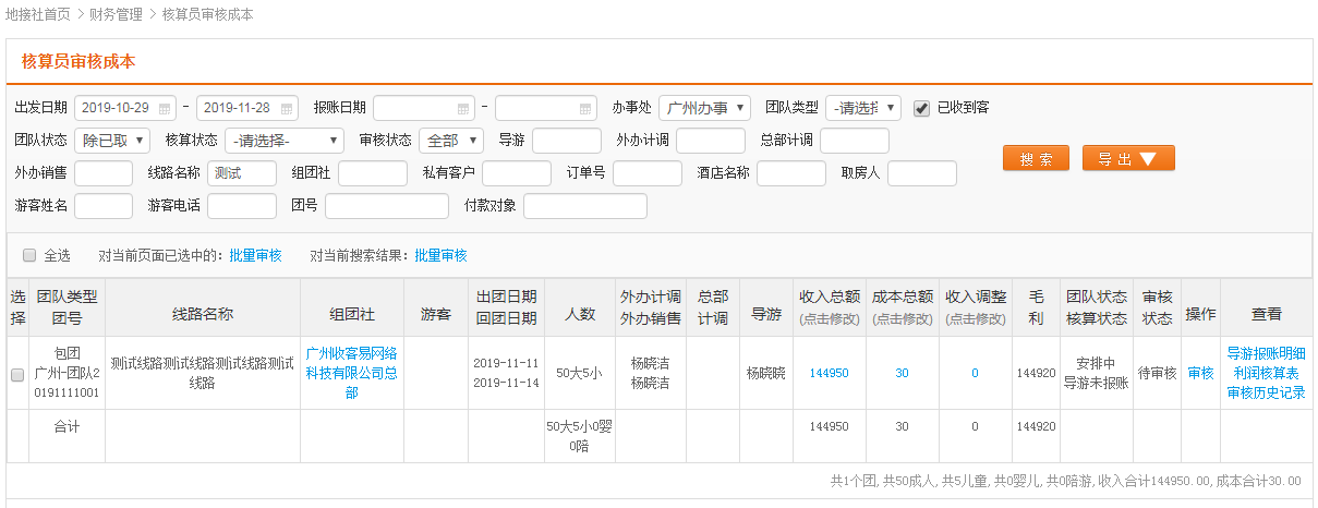 团队利润核算表:查看整个团的收入、成本等信息,并提供打印、导出功能