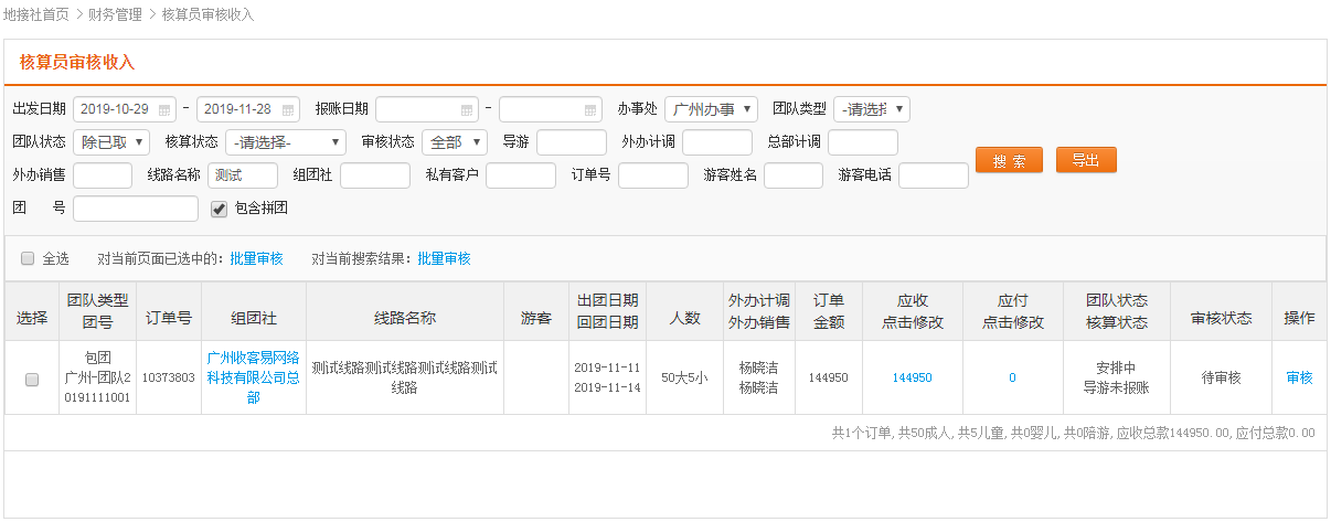 审核页,依次列出订单的应收和应付款明细,核对无误后审核通过
