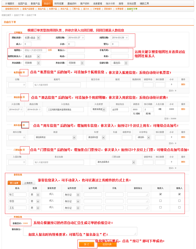 在导航条找到自由行,点击选择二级导航的“自由行下单”,进入下单页面