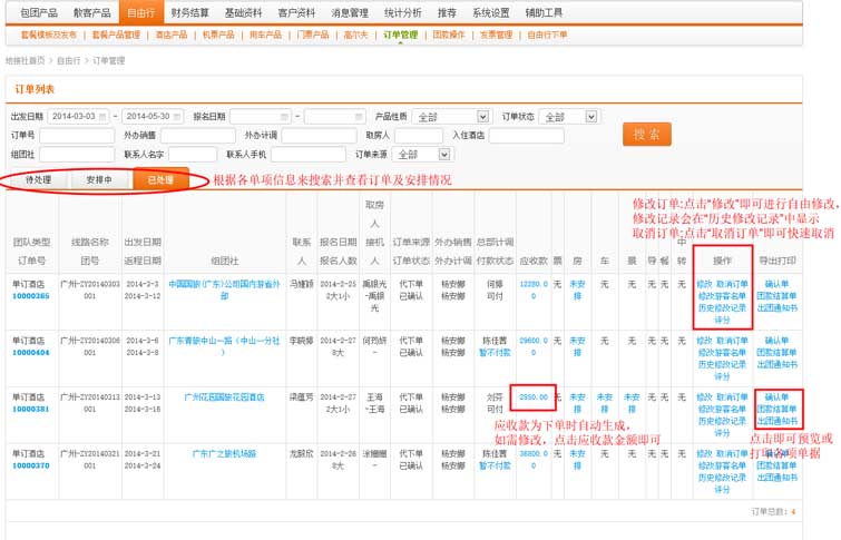 在导航条找到自由行,点击选择二级导航的“订单管理”,进入订单管理列表页