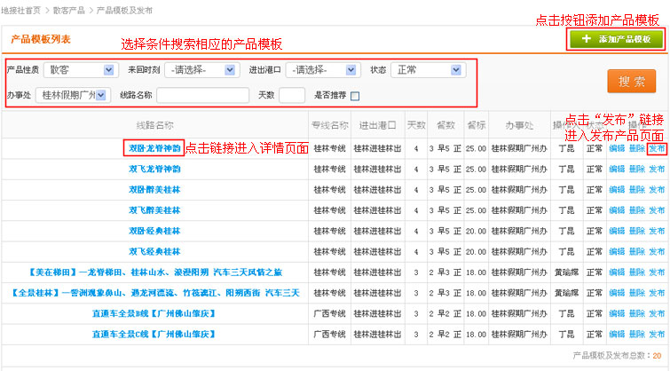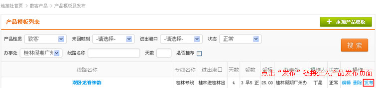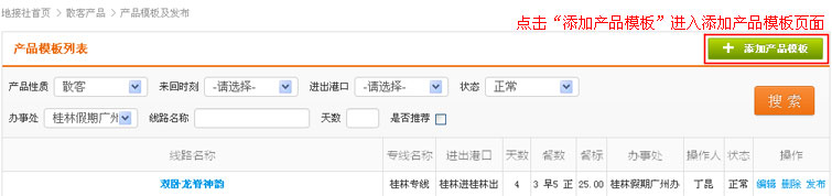 在导航条找到散客产品,点击选择二级导航的“产品模板及发布”,进入产品模板列表页