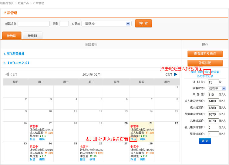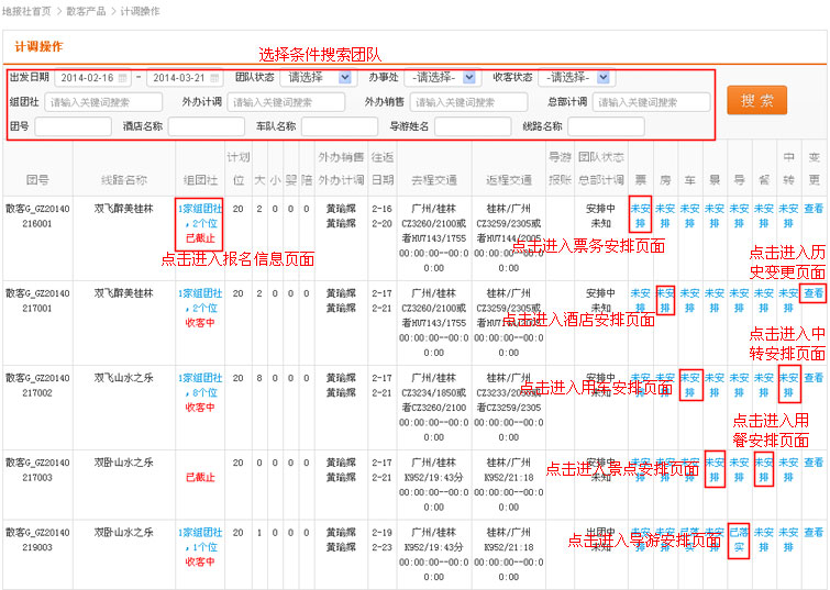 在导航条找到散客产品,点击选择二级导航的“计调操作”,进入计调操作列表页