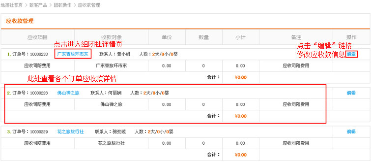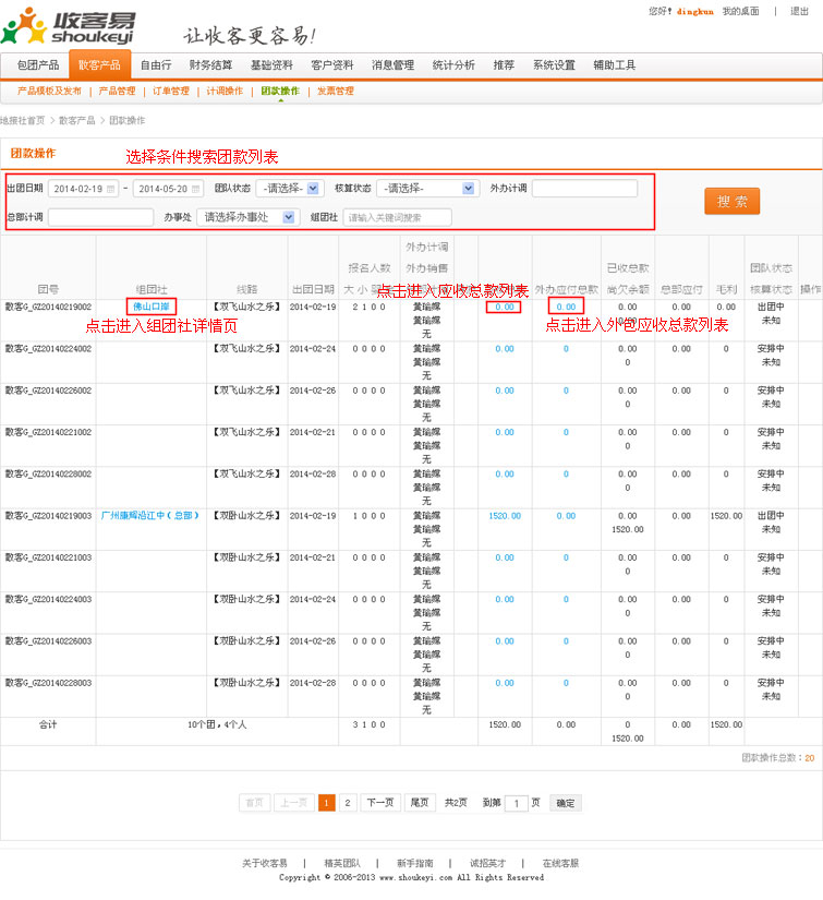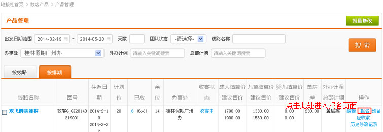 在导航条找到散客产品,点击选择二级导航的“团款操作”,进入团款操作列表页