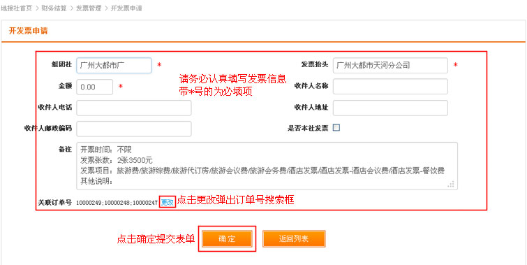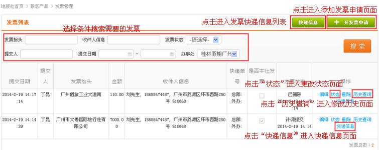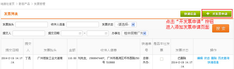在导航条找到散客产品,点击选择二级导航的“发票管理”,进入发票管理列表页