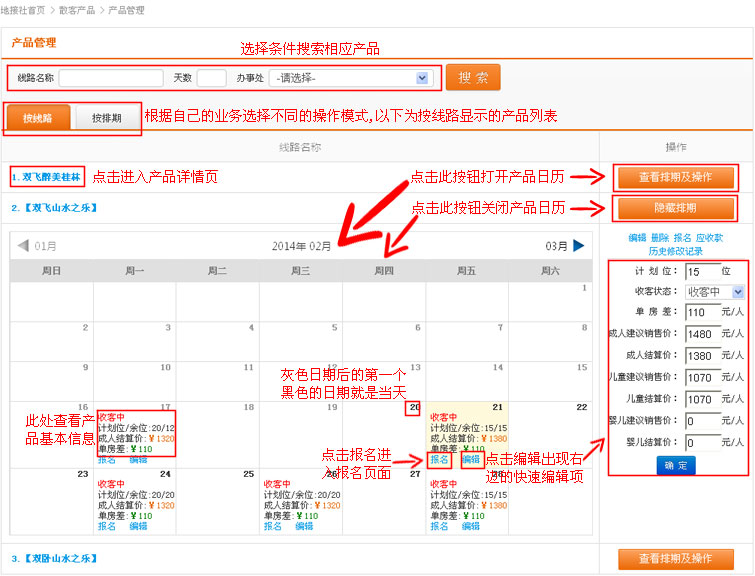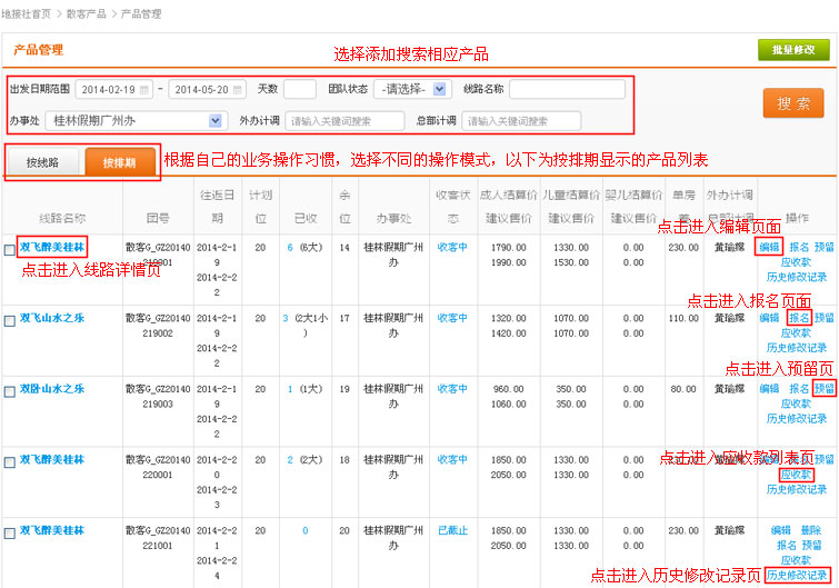 在导航条找到散客产品,点击选择二级导航的“产品管理”,进入产品管理列表页