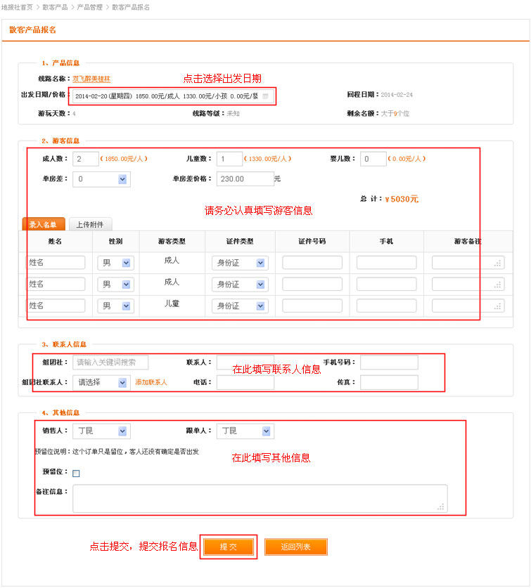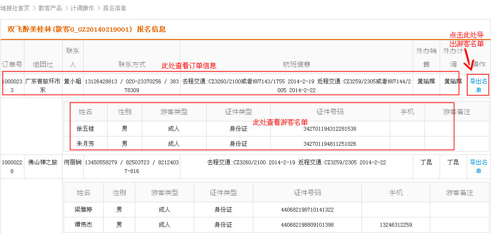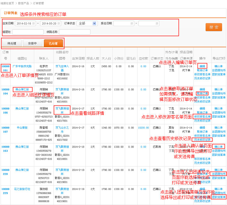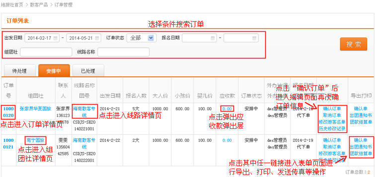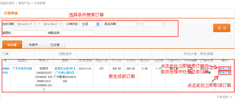 在导航条找到散客产品,点击选择二级导航的“订单管理”,进入订单管理列表页
