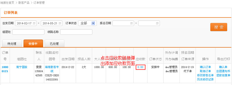 在订单管理的安排中”列表以及“已处理”列表中,找到应收款栏目的链接