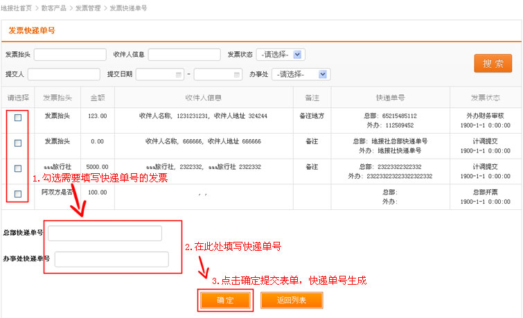 点击“快递信息”链接进入发票快递单号页面,你可以在此为你的发票填写快递发货单号。