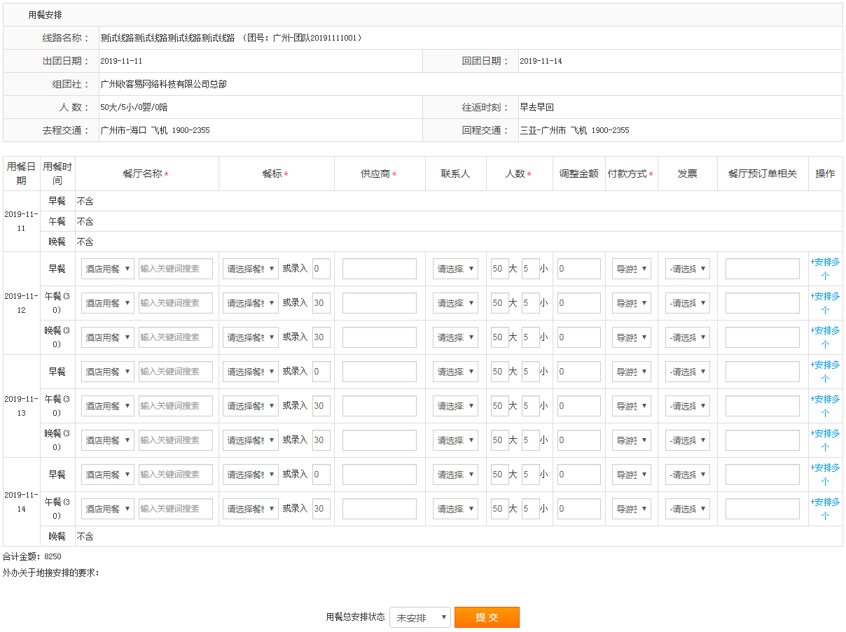 进入用餐安排页后,可以看到订单的计划要求,实际情况按页面信息填写后提交即可,提交后系统会自动根据您提交的数量和单价生成计划成本信息(应付餐费)。