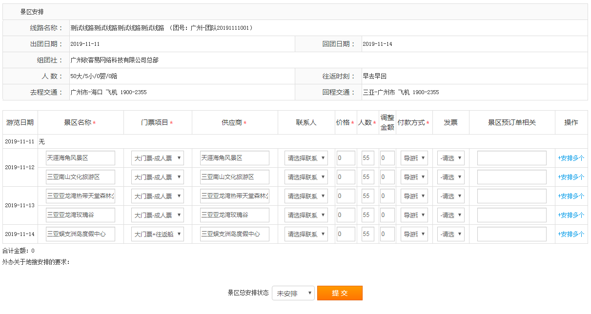 进入景点安排页后,可以看到订单的计划要求,实际情况按页面信息填写后提交即可,提交后系统会自动根据您提交的数量和单价生成计划成本信息(应付景点门票款)。