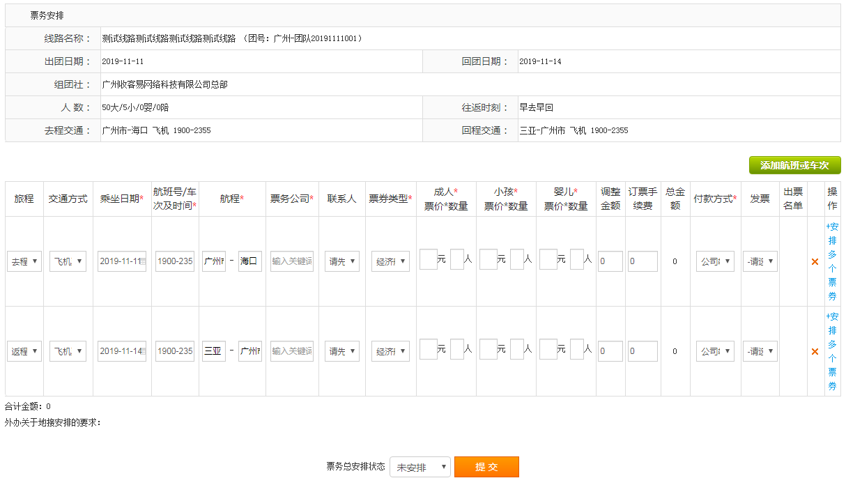 进入票务安排页后,按页面信息填写后提交,提交后系统会自动根据您提交的数量和单价生成计划成本信息(应付票款)。
