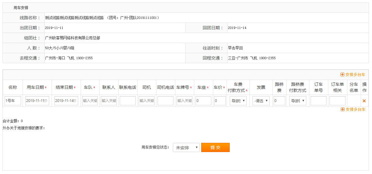 进入用车安排页后,可以看到订单的计划要求,实际情况按页面信息填写后提交即可,提交后系统会自动根据您提交的数量和单价生成计划成本信息(应付车费)。