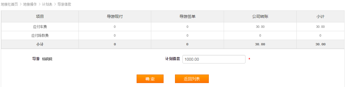 进入页面后,系统会列出计划的所有成本项目,并汇总公司转账、导游现付、导游签单的金额,为您的借款计划提供依据。