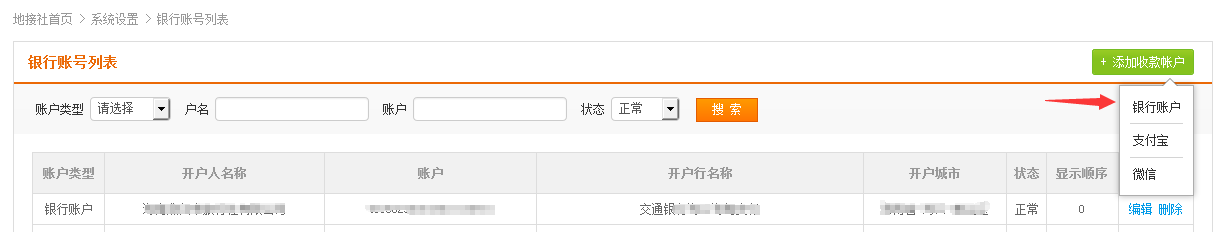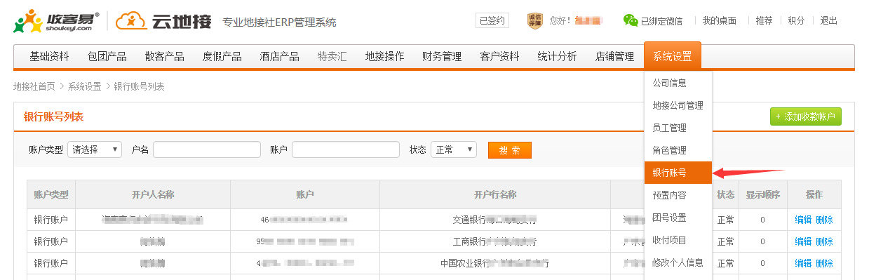 2.在导航条找到系统设置,点击 银行账号 进入收款账户列表页