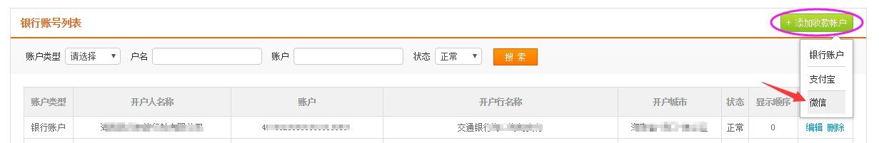在收款账户列表中找到“添加收款账户”按钮,然后点击 微信