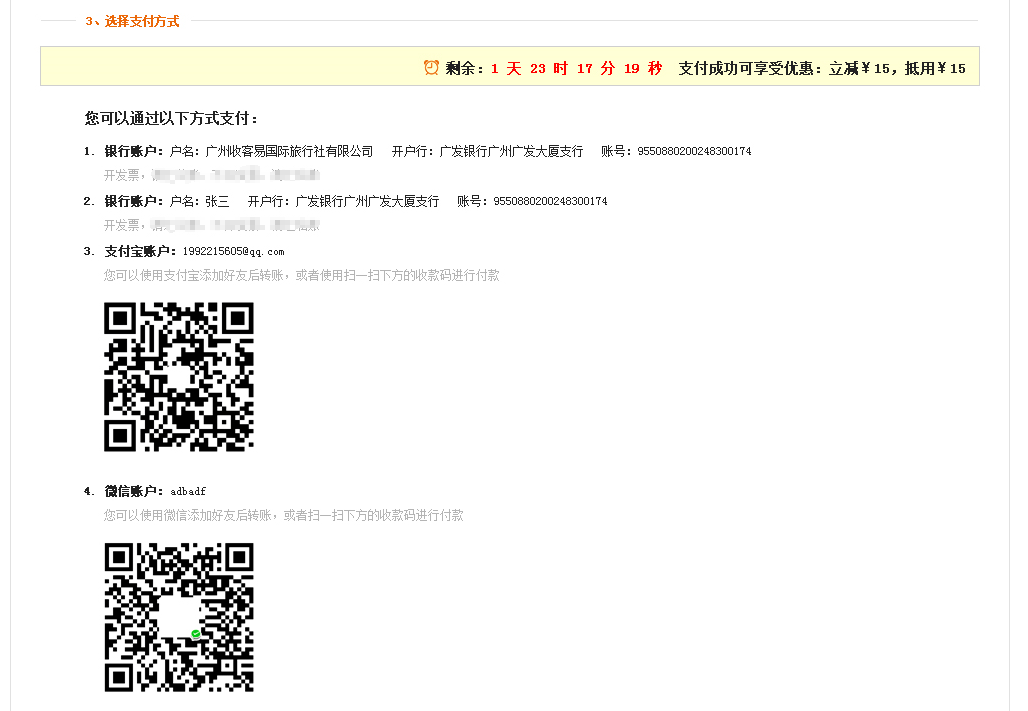 当您按要求设置好贵社的收款账户、且平台的收款方式为组团社直接付款供应商时,组团社看到的支付页效果如下图: