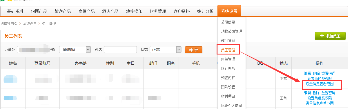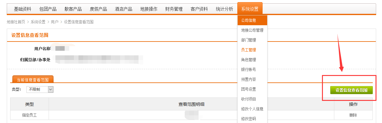 1、系统设置 - 员工管理,选择你要设置的员工用户,点击“设置信息查看范围”;