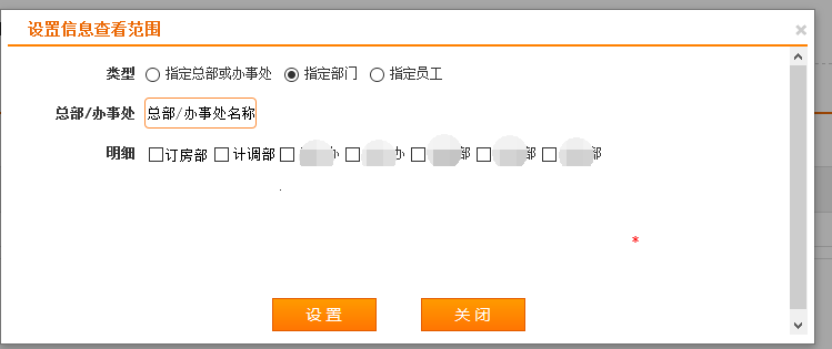 3、弹窗显示设置查看范围类型包括:指定总部或办事处、指定部门、指定员工;